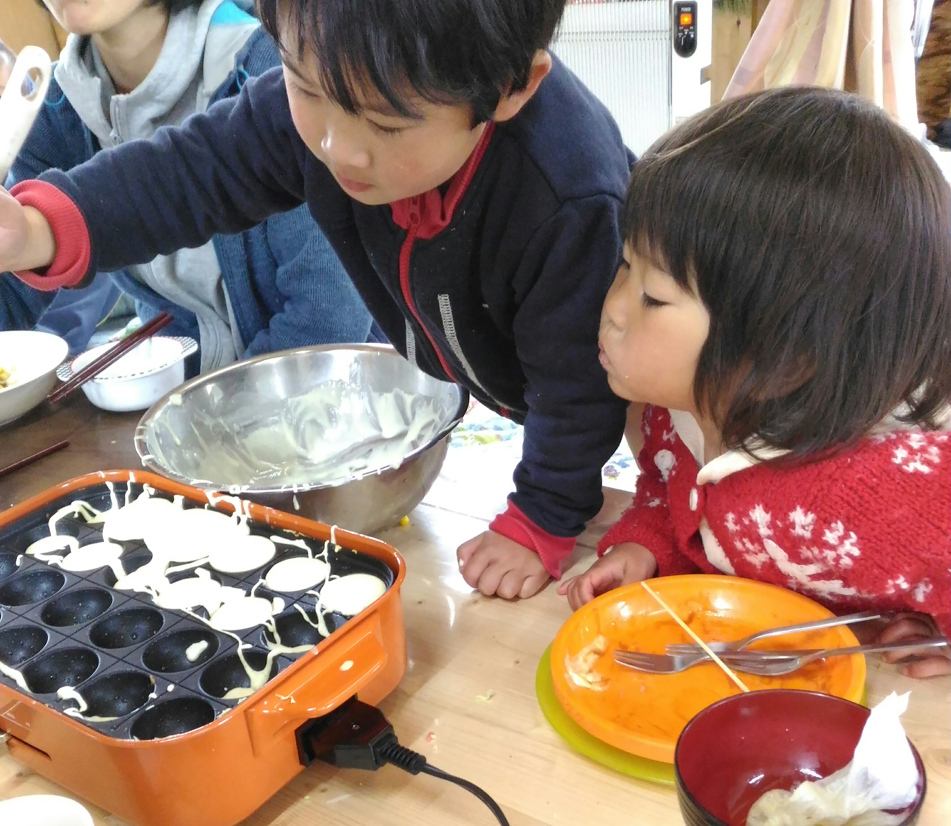 ホットケーキの生地をたこ焼き器に入れる仕事を任された彼、だんだん下唇が出てきます。