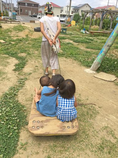 お腹が満たされたら、母ちゃんに台車を引っ張ってもらって三姉妹で遊び場をドライブ♪