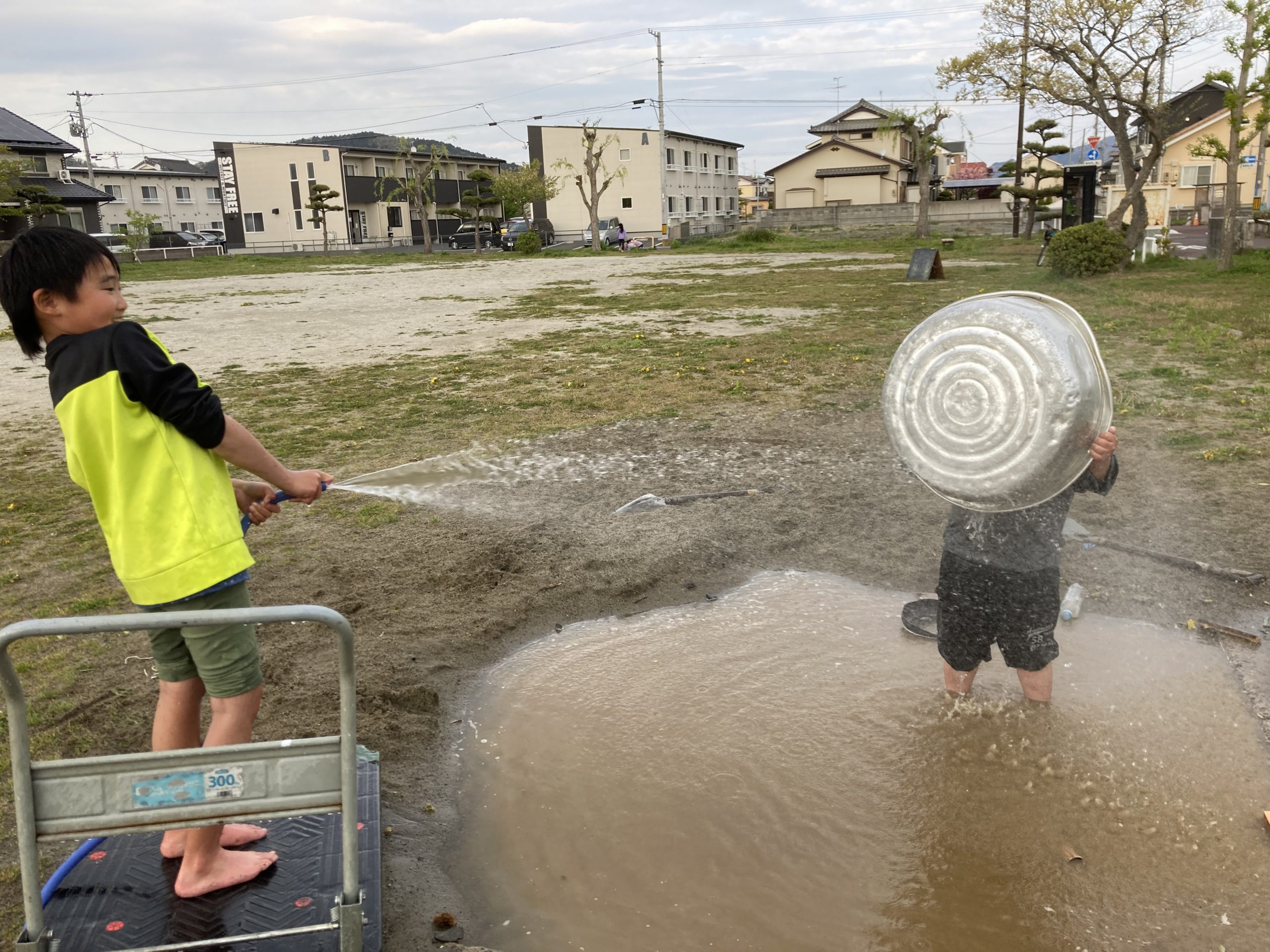 ➀砂場がプールになるのは毎度のこと!全身ずぶ濡れになって遊びます!