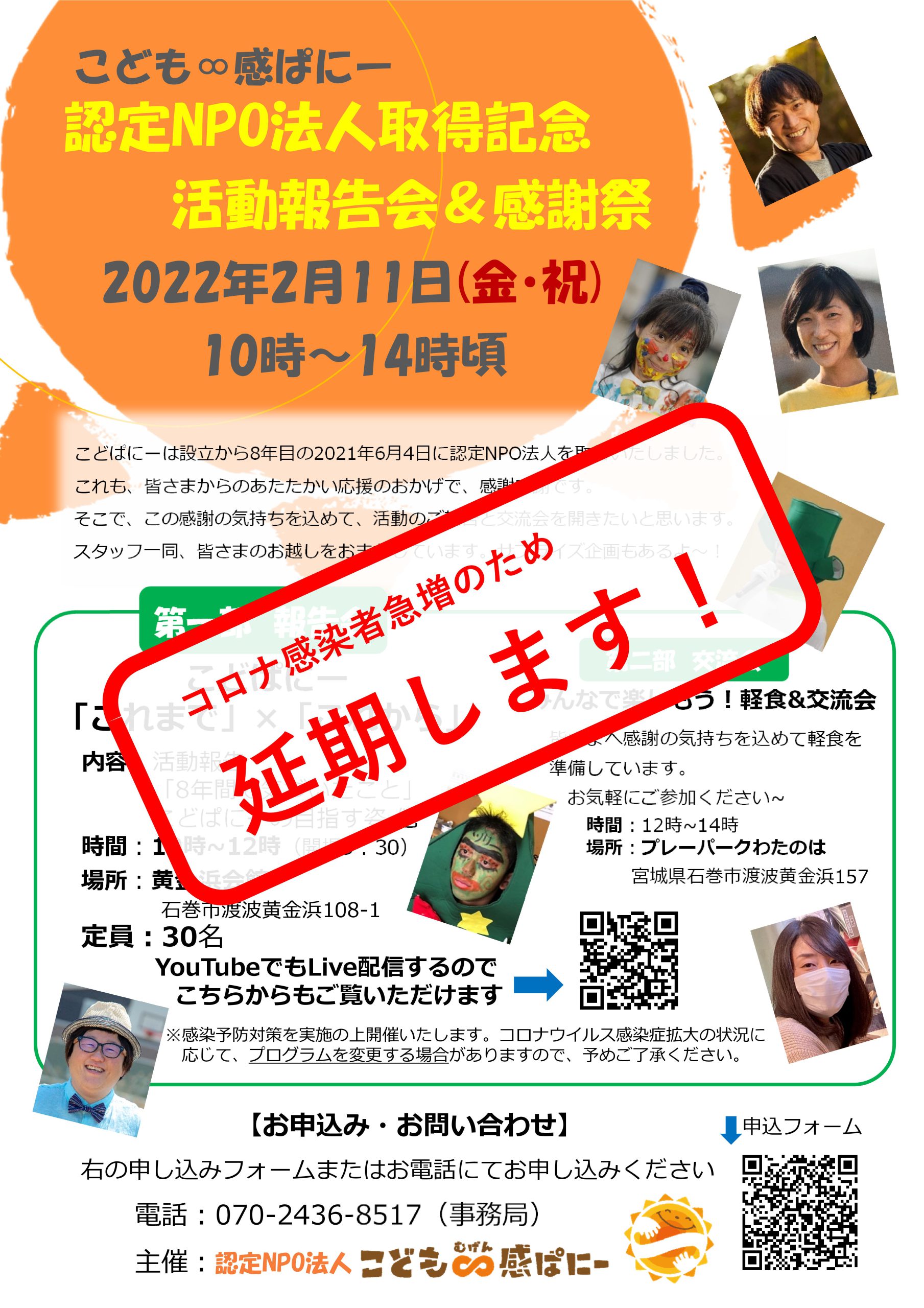 2022年2月11日(金・祝)に行う予定だった「認定NPO法人取得記念活動報告会&感謝祭」をコロナ感染拡大により延期いたします。